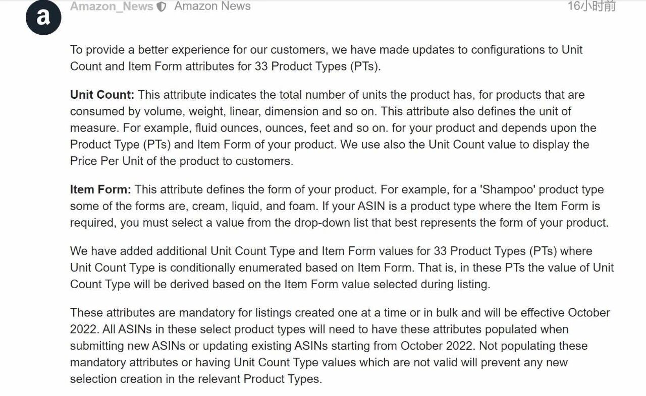 GSMA发布的数字社会指数报告显示:Shopee越南的用户达4450万,比去年增加了25.69%。 越南用户在移动设备上使用数字平台的趋势仍在增加,Google Play和Apple Store上的新应用下载量达到约3.12亿次,环比增长19%。其中GooglePlay应用商店的下载量最高,下载率为78.22%,IOS设备下载量则为22%。凭借这一数字,越南的移动设备新应用下载量继续在全球排名第七,仅次于印度、美国、巴西、印度尼西亚、中国和墨西哥。 越南数字平台上的用户总数达到4.94亿以上,比去年同期增长23.56%;越南数字平台用户比例约为移动设备数字平台用户总数的20.33%,略高于上月。 同时,越南使用平台的时间超过9.34亿小时,占平台总使用时间的13.77%,比上个月增加了1.2%。每个智能手机用户每月使用手机平台的时间约为9.93小时,比2022年1月增加4.67%,比前一个月增加11.44%。 ![]() 二、亚马逊更新33种产品类型的属性配置!美亚和欧亚更新了33种产品类型的单位计数和产品类型的属性配置,10月起卖家需对创建的Listing或批量创建的listing填充新更新的属性,否则将无法上架。 单位计数:此属性表示产品的总单位数,适用于按体积、重量、长度、尺寸等产品。此属性还定义了度量单位。根据产品的产品类型(PT)和产品形式匹配例如液量盎司、盎司、英尺等单位。使用单位计数值还会向买家显示产品的每单位价格。 产品类型:此属性定义产品的产品类型。例如对于“洗发水”产品类型,可以分为霜状、液体和泡沫质地。如果您的ASIN是需要商品表格的产品类型,您必须从下拉列表中选择一个最能代表产品类型的选项。 亚马逊为33种产品类型(PT)添加了额外的单位计数类型(Unit Count Type)和产品类型(Item Form)值,其中单位计数类型是基于Item Form有条件地枚举的。也就是说,在这些产品类型中,单位计数类型的值将根据上架时选择的产品类型值来确定。 这些属性对于一次创建或批量创建的Listing是强制性的要求,并且将于2022年10月生效。从2022年10月开始,在提交新ASIN或更新现有ASIN时,这些选定产品类型中的所有ASIN都需要填充以上属性。不填充以上强制属性或具有无效的单位计数类型值将无法上架。
