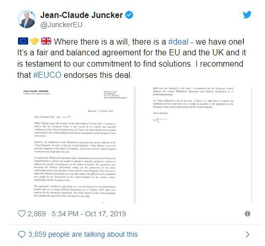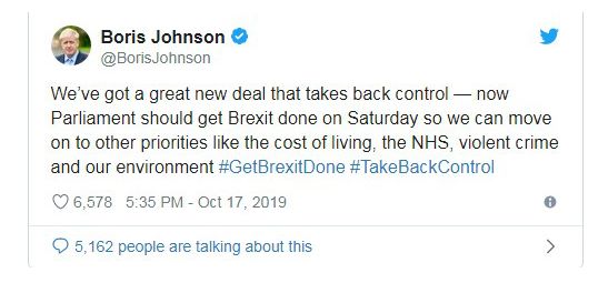 英国首相约翰逊:英国与欧盟达成新脱欧协议据悉,来自英国和欧盟的谈判代表已经在谈判的最后时刻和欧盟峰会即将召开之际,达成了脱欧协议草案。 英国首相鲍里斯·约翰逊发布推文称:“我们已经达成了一项伟大的新协议。”他呼吁英国立法者支持该协议,该协议将于本周六(10月19日)提交英国国会。 同时,欧盟委员会主席容克表示,这是一份公平且平衡的协议。 在周四(10月17日)和周五(10月18日)举行的欧盟领导人峰会将讨论敲定脱欧协议,之后英国立法机构将在本周末讨论协议相关事宜。 欧盟领导人将批准该协议草案,英国大多数议员也将在周六可能举行的议会会议上批准该草案。欧盟议会也需批准该协议,但时间尚不明确。 如果在10月19日之前未能达成协议,英国首相鲍里斯·约翰逊需将原定于10月31日的脱欧日期延后。