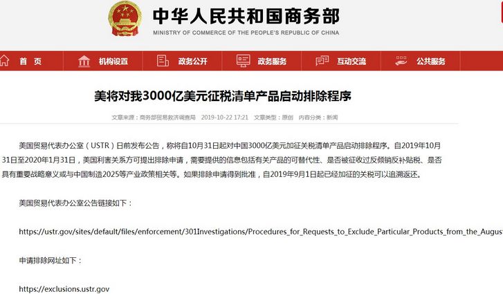 美国宣布将于10月31日启动对华关税加征清单排除流程据悉,美国贸易代表办公室(USTR)日前宣布,自2019年10月31日起,将对301条款加征15%关税的中国进口商品,启动关税排除流程,并将于2020年1月31日结束。 据了解,届时它将通过USTR的在线排除请求处理门户网站exclusions.ustr.gov接收排除请求;有关申请程序的详细信息将于下周在《联邦公报》上发布。预计有关申请流程细节的详细信息类似于List 3规定的申请流程。产品要被排除在外,美国进口商需要证明:(a)来自美国的供应不足;(b)加征关税造成严重的经济损害;(c)进口商品未在“中国制造2025”清单中。 申请排除需要:该产品对应的10位美国海关编码,简洁明了地说明产品的物理特性信息,以便美国海关可以进行排除。 美国贸易代表办公室最初于2019年8月6日宣布,将对List 4A清单所列的约2500亿美元中国进口商品征收10%的额外关税,但由于局势持续紧张以及贸易谈判受阻,2019年8月26日,美国贸易代表宣布将关税税率提高至15%。部分商品曾延迟加征关税,对于List 4B清单上的进口商品所额外征收的15%关税将于2019年12月15日生效。 与此同时,中国商务部也在昨天(10月22日)发布了消息提示。 据USTR的公告,自2019年10月31日至2020年1月31日,美国利害关系方可提出排除申请,需要提供的信息包括有关产品的可替代性、是否被征收过反倾销反补贴税、是否具有重要战略意义或与中国制造2025等产业政策相关等。如果排除申请得到批准,自2019年9月1日起已经加征的关税可以追溯返还。